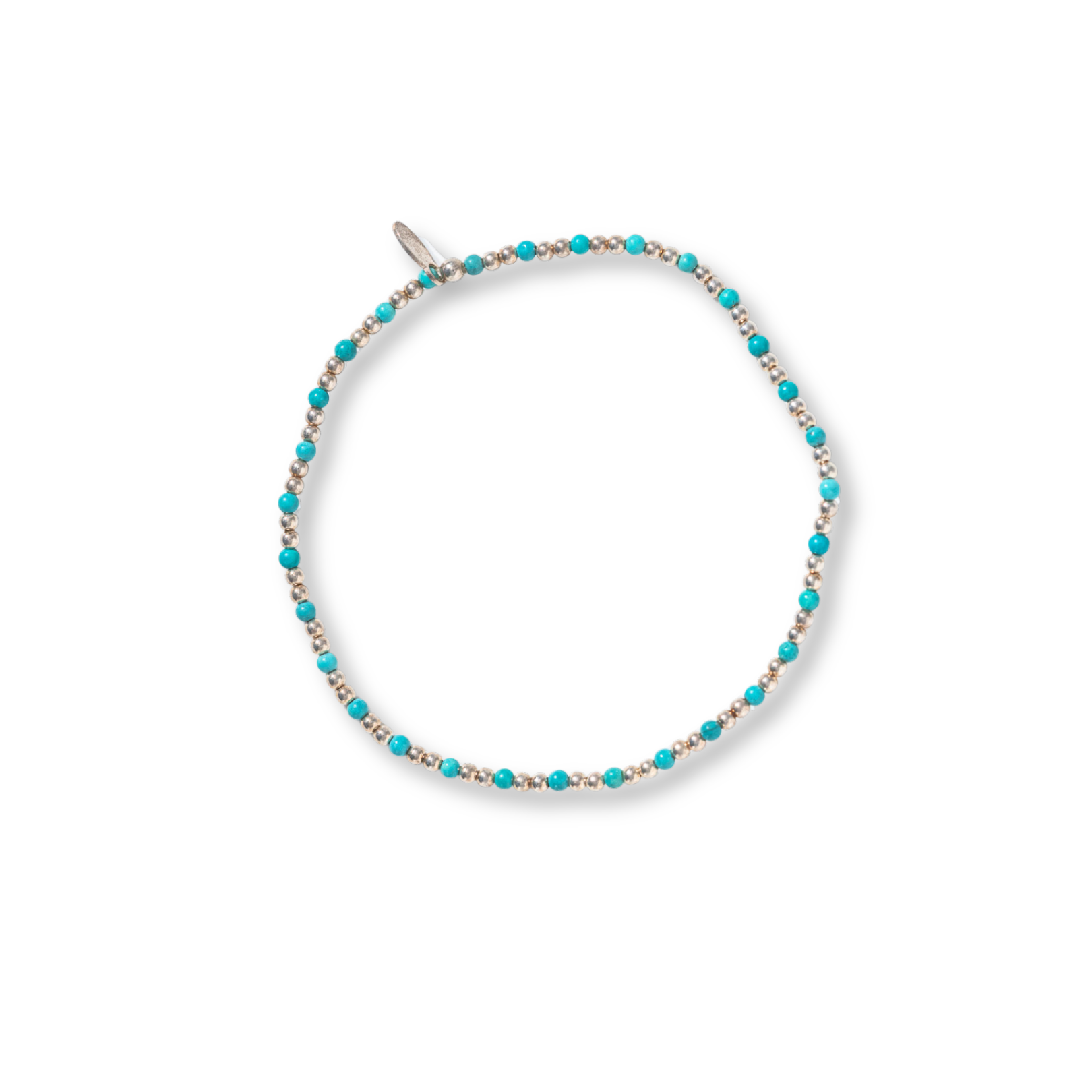 Bracelet délicat et minimaliste, monté sur fil élastique, composé de petites billes en argent sterling et de pierres de turquoise bleu ciel.